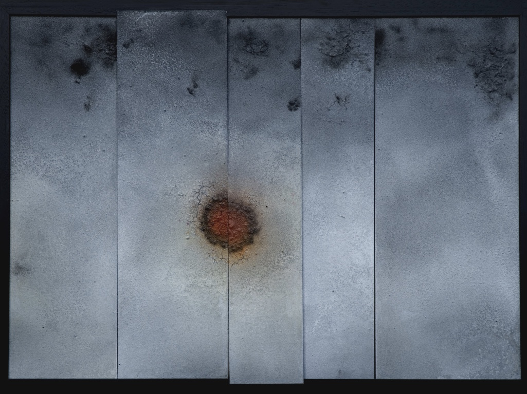 Dark Matter (Dunkle Materie) umfasst ca. 15 Arbeiten aus den Jahren 2015 bis 2017. Der Titel nimmt zunächst Bezug auf die verwendeten Materialien: dunkle Pigmente, schwarze Lavasande. Der Titel meint aber ebenso jene Elementarteilchen, von denen das All bevölkert ist und die noch niemand gesehen hat: dunkle Materie. Schließlich die Bildlösungen: unirdische Landschaften, die sich aus dem schwarzen Abgrund zu erheben beginnen, sterbende Sterne, tote/rote Zwerge und andere Objekte, die aus einem Atlas galaktischer Formen stammen könnten und doch in ihnen nicht zu finden sind.